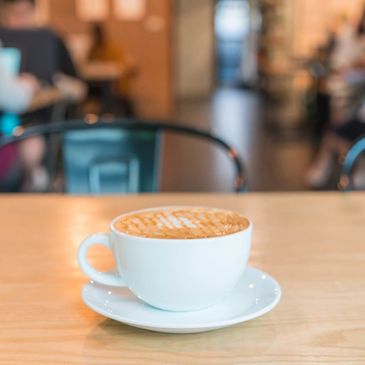 Café recién preparado, bebidas calientes y frías, y acompañamientos ligeros.